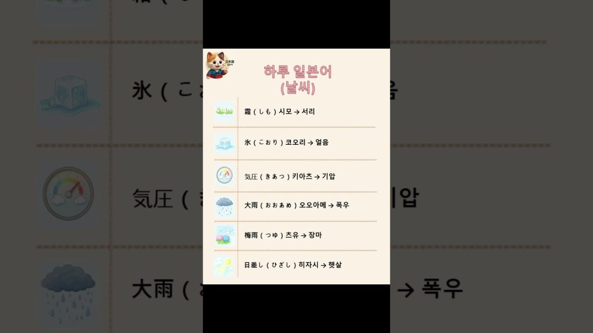 오늘의 일본어 날씨 단어 6개 ☁️ 霜(しも)– 서리 氷(こおり)– 얼음 気圧(きあつ)– 기압 大雨(おおあめ)– 폭우 梅雨( …