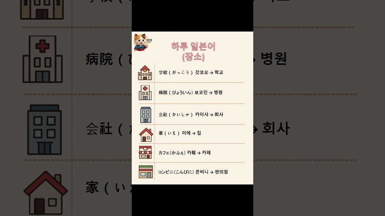 오늘은 일상에서 자주 쓰는 장소 일본어 6개를 한 번에 정리해봤어요 학교(がっこう), 병원(びょういん), 회사(かいしゃ), 집( …