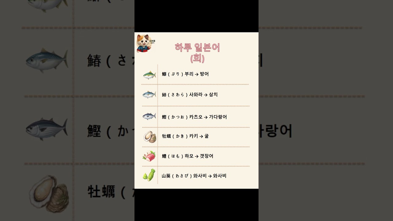 일본 회집에서 바로 쓰는 핵심 단어 6개를 정리해요: 방어(ぶり) / 삼치(さわら) / 가다랑어(かつお) / 굴(かき) / 갯장어(はも) / 와사비( …